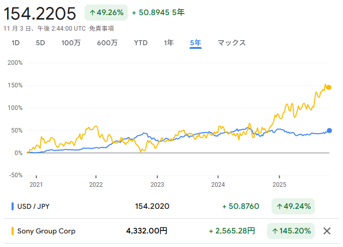 5年間でドル円が約50%上昇する中、ソニー株は140%超のリターン。