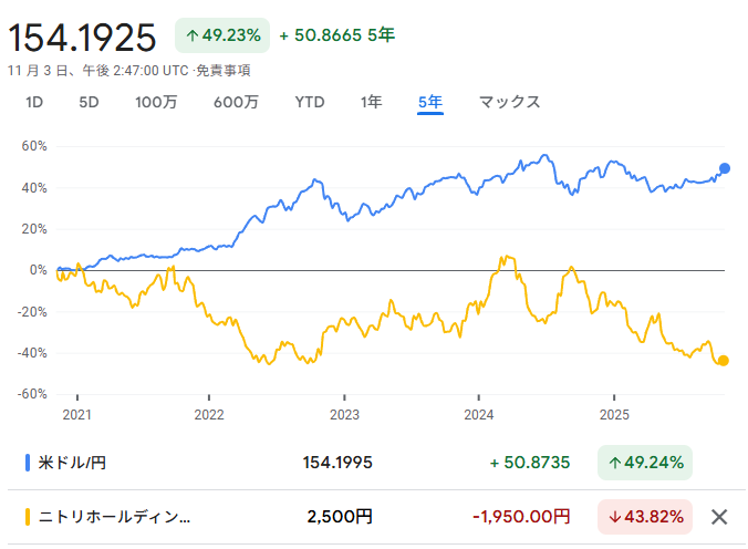 - ニトリは家具やインテリア用品の多くを海外で生産・輸入しており、円安は原価上昇要因になる。