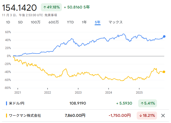 円安5年の中で株価が下落したワークマンは、典型的な円安デメリット銘柄。