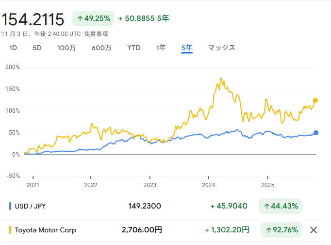 (出典:Google Finance) 2020〜2025年のドル円(青)とトヨタ株(黄)の推移。