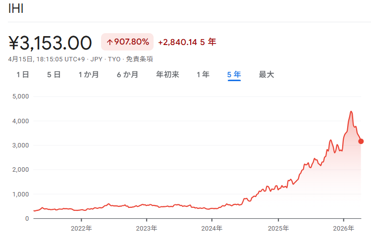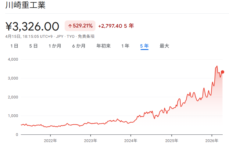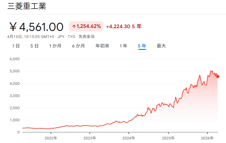 2022年以降、防衛費増額の流れを受けて株価は大きく上昇。約3年間で株価は約3倍近くに成長しており、地政学リスクと強い相関を持つ。